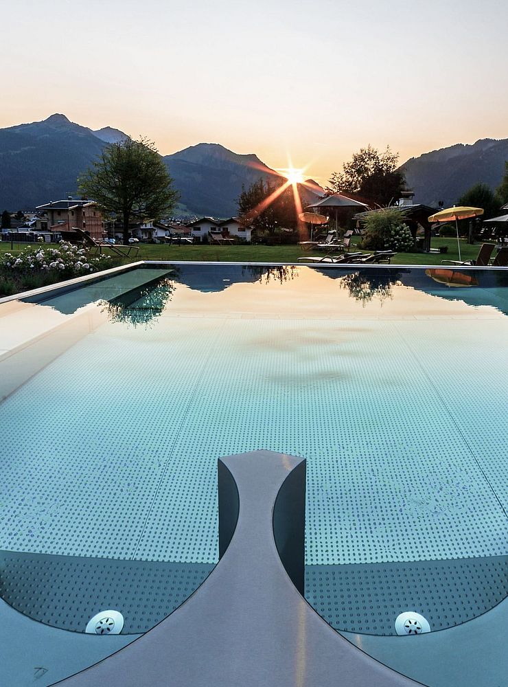 Ein wohlig-warmer Ort der Erholung im Winter, geöffnet von 7:30 bis 19:00 Uhr. Wenn die Schneeflocken sich sanft über die Landschaft legen, baden Sie im beheizten Felsenpool. Lassen sich treiben und genießen die Aussicht. Das geht natürlich auch im Sommer, wenn sich die Bergspitzen in der Wasseroberfläche spiegeln und im Hintergrund das Vogelgezwitscher den Soundtrack zu Ihrem Erholungsmoment liefert. Massagedüsen sorgen für übersprudelnde Freude im Innen- und Außenbereich. Außerdem befinden sich hier auch großzügige Ruheräume, die Plauderstube und die Textilsauna für die ganze Familie.